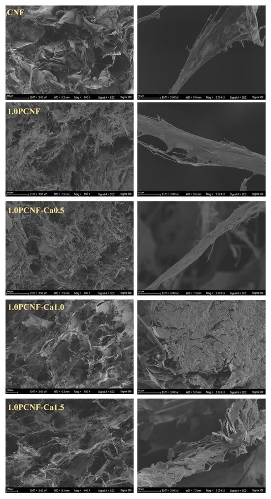 As shown in Figure 2, further morphological analysis of cellulose revealed that CNF, 1.0PCNF, 1.0PCNF-Ca0.5, 1.0PCNF-Ca1.0, and 1.0PCNF-Ca1.5 consisted of porous networks composed of microfibers. Notably, 1.0PCNF-Ca0.5, 1.0PCNF-Ca1.0, and 1.0PCNF-Ca1.5 exhibited tighter connections and greater strength due to cross-linking and the deposition of calcium ions with phosphorylated cellulose. In comparison to 1.0PCNF-Ca1.0, the microfibers of 1.0PCNF-Ca0.5 were excessively fine, while those of 1.0PCNF-Ca1.5 were fragmented. In conclusion, the morphology of 1.0PCNF-Ca1.0 is superior [26].