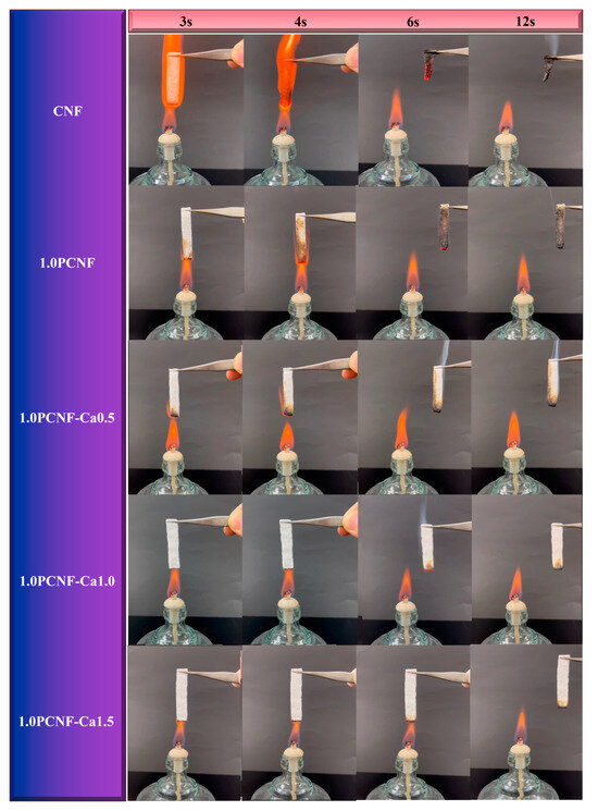 The results of the vertical combustion tests conducted on the prepared porous flame-retardant materials are presented in Figure 3. CNF did not undergo any modification treatment and was not dried before testing. It was observed that CNF exhibited no flame-retardant effect [27]. In fact, CNF ignited readily, with flames spreading rapidly in a vertical direction until the entire sample was consumed, resulting in the formation of a carbon residue. In contrast, the flammability of PCNF was significantly diminished, and small bubbles could be observed on its surface post-combustion. This phenomenon may be attributed to the formation of a protective carbon layer by the phosphorylated groups [28]. As illustrated in Figure 3, when the concentration of PCNF remained constant, the flame-retardant performance of the material improved with an increase in the concentration of Ca2+. Conversely, the PCNF-Ca composite flame-retardant material exhibited self-extinguishing behavior. These findings indicate that Ca2+ plays a significant role in enhancing flame-retardant performance [29].