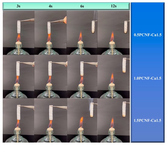 Flame-retardant test for 0.5PCNF-Ca1.5, 1.0PCNF-Ca1.5, and 1.5PCNF-Ca1.5.