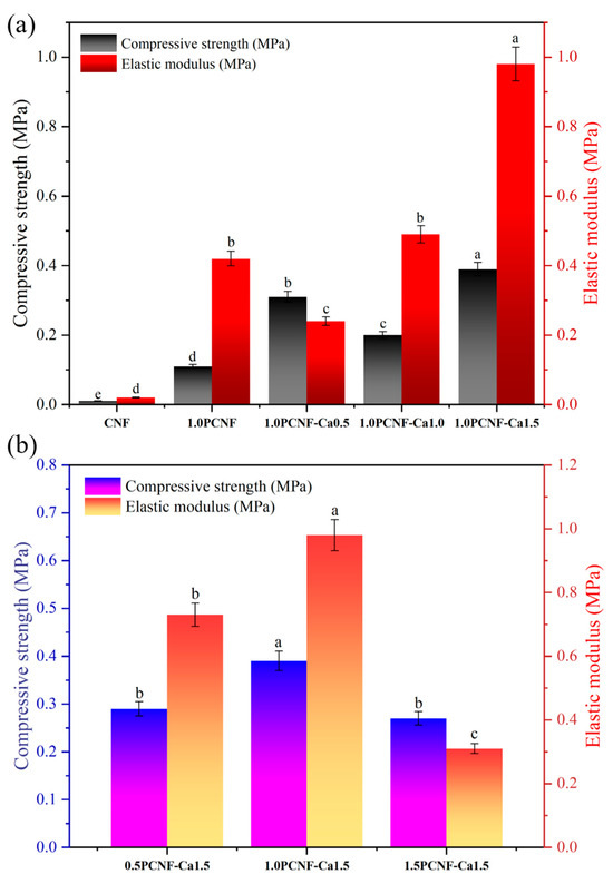 Conversely, as depicted in Figure 5b, when the amount of calcium ions was held constant, an increase in the PCNF concentration led to an initial enhancement in the mechanical properties of the material, followed by a decline [35]. This indicates that the optimal mechanical properties of the aerogel, comprising calcium ions and PCNF, were achieved only at a specific additive ratio. Overall, the combination of PCNF at a concentration of 1.0 and calcium ions at 1.5 yielded the best mechanical properties [36].