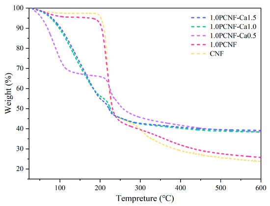 TG curves of CNF, 1.0PCNF, 1.0PCNF-Ca0.5, 1.0PCNF-Ca1.0, and 1.0PCNF-Ca1.5.