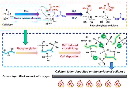 The principles underlying the chemical modification are illustrated in Figure 7. The hydroxyl groups of cellulose were combined through covalent (especially phosphoester) linkages. Under heating conditions, diammonium phosphate generated ammonia gas, water vapor, and substances containing phosphate ions [42]. Freeze-drying removed H2O and NH4+, resulting in the formation of phosphorylated cellulose, which reduced the number of free hydroxyl groups and enhanced both the mechanical and flame-retardant properties [43]. Phosphorylation reactions conferred flame retardancy to the cellulose at high temperatures. However, they also increased carbonization reactions. Subsequently, calcium ions contributed to the preparation of the material through self-assembly and surface deposition effects [44], thereby achieving more effective flame retardancy. The specific effects can be observed in the video provided in the Supplementary Materials. During combustion, a carbonized layer formed on the surface of the material, which minimized the introduction of oxygen and thereby improved the flame-retardant effect [45]. As the temperature rose, the rate of carbon oxidation accelerated, while the supply of oxygen gradually became insufficient. The rate of oxygen transport within the boundary layer played a critical role in controlling the erosion rate [46].
