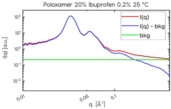 Scattering intensity of the P407 sample (20%) and ibuprofen (0.2%) at 25 °C. The red curve represents the total scattering, and the blue curve represents the scattering without the constant contribution, depicted by the green curve. We observe that the difference in contribution is only significant for q > 0.075 Å−1.