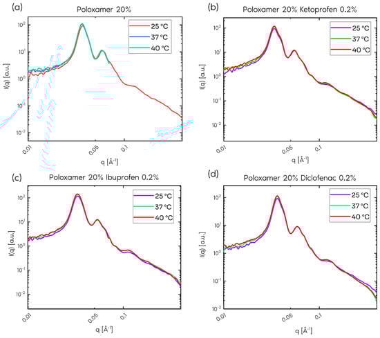 Small-angle neutron scattering (SANS) curves for sample with 20% poloxamer (a), 20% poloxamer and 0.2% ketoprofen (b), 20% poloxamer and 0.2% ibuprofen (c), and 20% poloxamer and 0.2% diclofenac (d).