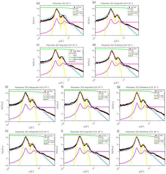 For this study, analyses were performed with the anti-inflammatory drugs ibuprofen, ketoprofen, and diclofenac. Figure 3 shows the scattering curves and the functions used for data modeling, for P407 samples without and with ibuprofen, ketoprofen, and diclofenac at 25 °C, 37 °C, and 40 °C.