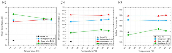 (a) Variation in the average radius parameter (Rm) of the micelle core with temperature; (b) variation in the effective radius (Reff) with temperature; and (c) variation in the lattice parameter (Equation (16)) with temperature for P407 samples containing ketoprofen, ibuprofen, and diclofenac.