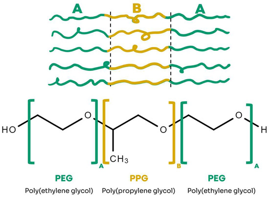 The samples analyzed at HZB using the SANS technique contained 20% poloxamer (P407). P407 is a tri-block copolymer composed of a hydrophobic central block of poly(propylene glycol) (PPG), surrounded by two hydrophilic blocks of poly(ethylene glycol) (PEG). The central block consists of 56 PPG units, represented by B, while the ends are formed by 101 PEG units (A), as illustrated in Figure 6. P407 has a molecular mass of 12,600 g/mol and a hydrophilic–lipophilic balance (HLB) of 22 [49].