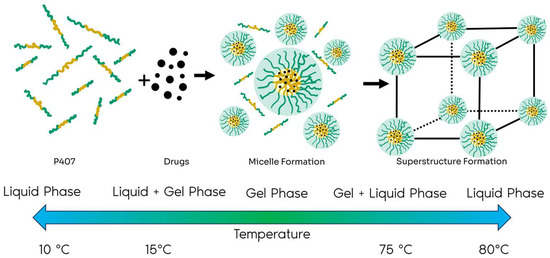 Schematic illustration of the formation of micelles and gels of P407. The phase transitions include liquid–gel, which occurs at approximately 15 °C, and gel–liquid, observed at around 75 °C. Adapted from [50].