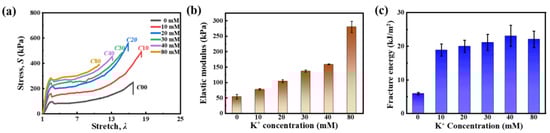 Tensile mechanical properties of the κ-carrageenan/PAAm hydrogel with various K+ concentrations. (a) Stress–stretch curves of hydrogel with varying K+ cation concentrations, labeled as C00, C10, C20, C30, C40, and C80, respectively. (b) Effects of K+ concentration on elastic modulus. (c) Effects of K+ concentration on fracture energy.