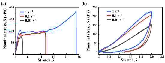 Viscoelastic behavior of the C80 hydrogels. (a) Stress–stretch curves measured at different loading rates. (b) Cyclic loading–unloading tests performed at different loading rates.