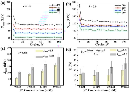 The maximum stress Smax is used to characterize the density of double helix aggregation crosslinked points. In Figure 6a,b, C80 always shows a larger maximum stress Smax than the other samples, indicating that the increase in K+ concentration can increase the density of double helix aggregation. In the first cycle, the maximum stress Smax of C80 reached 161.77 ± 16.23 kPa at λmax = 1.5 (Figure 6c). The Smax values increased from 56.05 ± 5.99 kPa for C00 to 88.01 ± 8.87 kPa for C10, and to 112.67 ± 12.77 kPa for C20. The increase in K+ concentration leads to changes in the density of double helix aggregation, resulting in the Smax increase. When λmax is 2.0, the Smax also becomes larger because both the double helix aggregation and chemical crosslinking points are further broken. Meanwhile, the C80 attains a higher shakedown ratio of Smax (ϕS) than the other samples and exhibits a more obvious stress softening behavior (Figure 6d). This is because of the incomplete reforming of double helix aggregation in the C80 sample within the short time scale of one loading cycle.