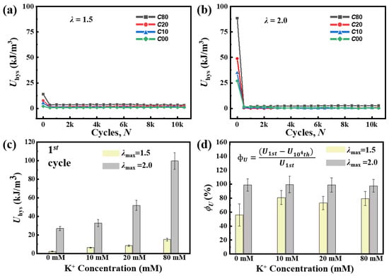The evolution of the energy dissipation Uhys in the shakedown behavior of a κ-carrageenan/PAAm hydrogel. (a,b) Uhys of C00, C10, C20, and C80 samples in each cycle under the maximum stretches λmax = 1.5 and λmax = 2.0. (c) Uhys measured during the 1st cycle of the cyclic load. (d) The shakedown ratio of Uhys, ϕU, of these hydrogels.
