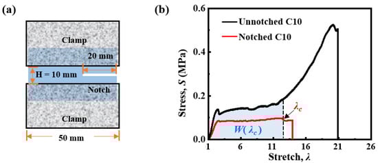 A sample without a notch was firstly loaded all the way to rupture and the stress–stretch curve is obtained (Figure 8b). Then, another sample with a notch was loaded and the stress–stretch curve was recorded until the onset of crack propagation at a critical stretch λc. The energy density W(λc) was calculated as the area under the stress–stretch curve of the sample without a notch at λc. The fracture energy of samples was calculated from