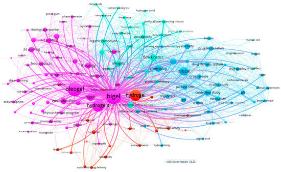 The first cluster prominently features the terms bigel and oleogel, represented as the largest nodes on the map. This indicates that these terms are among the most studied and interconnected concepts within the network. Other significant terms, including hydrogels, 3D printing, rheology, emulsification, and beeswax, highlight a growing interest in the development of structured materials and their applications in food and biomaterials.