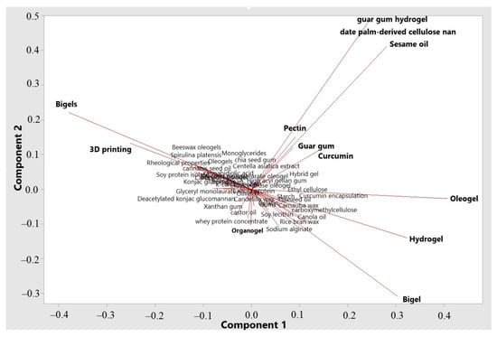 The biplot shows that the terms ‘bigel’, ‘hydrogel’, and ‘oleogel’ have long vectors pointing in the same direction, suggesting strong correlations and their status as interconnected concepts within the research field. In contrast, ‘3D printing’ and ‘bigels’ point in different directions, indicating they represent distinct approaches yet remain interrelated. This indicates their significance and representativeness in the analyzed studies.