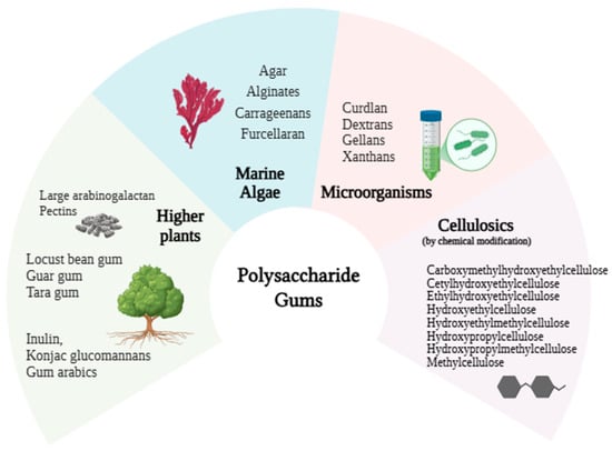 Classification of polysaccharide gums. (Created in BioRender (https://app.biorender.com; accessed on 18 March 2024): Scientific Image and Illustration Software).