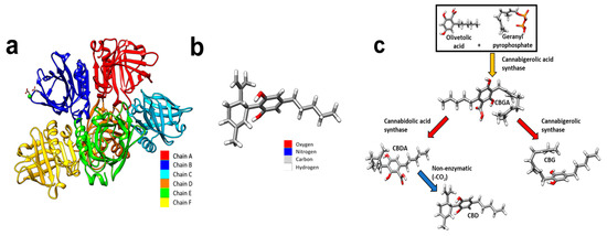 (a) Coloured depiction of the chains of beta-lactoglobulin. Beta-lactoglobulin consists of 6 chains, A–F. A—red, B—blue, C—cyan, D—orange, E—green, and F—yellow. (b) A schematic of a CBD molecule. (c) A schematic demonstrating the biosynthesis of CBD. Cannabigerolic acid (CBGA) is produced by interaction of olivetolic acid and geranyl pyrophosphate. CBGA is degraded into CBDA. CBDA is further degraded into CBD. Molecular graphics were made and analyses were performed with University of California, San Fransico (UCSF) Chimera [17]. The beta-lactoglobulin molecular structure was sourced from PubMed and the glutamic acid molecule was sourced from PubChem.