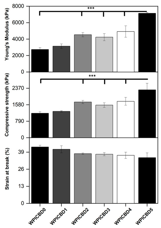 The results for the compression analysis of the WPI/CBD hydrogels. The results for Young’s modulus (kPa), compressive strength (kPa), and strain at break (%) are depicted. Each bar represents the mean ± SD of n = 10 (*** p < 0.001; compared to the WPI control).