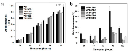 (a), representative CBD release data at each timepoint. The chart maps the release of CBD over 120 h. WPI has no CBD. The WPI/CBD1 samples contain 10 μΜ CBD. The WPI/CBD2 samples have 20 μM CBD. The WPI/CBD3 samples contain 30 μM CBD. The WPI/CBD4 samples have 40 μΜ CBD. The WPI/CBD5 samples have 50 μΜ CBD. The absorbance was analysed at 273 nm. Each bar represents the mean ± SD of n = 15 (*** p < 0.001; compared to the WPI control). (b), relative release percentage of CBD.