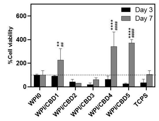 The results of % cell viability and proliferation of MC3T3-E1 pre-osteoblasts seeded on WPI/CBD hydrogels relative to WPI0 (set as 100%). TCPS is tissue-culture-treated polystyrene and serves as control. Absorbance readings at 570/600 nm were taken at days 3 and 7. Each bar represents the mean ± SD of n = 6 (** p < 0.01, **** p < 0.0001; compared to the WPI control) (## p < 0.01, #### p < 0.0001; compared to the TCPS control).