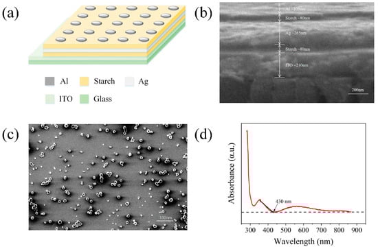 (a) Structural diagram of the Al/starch/Ag/starch/ITO memristor. (b) Cross-sectional SEM image of the device. From top to bottom: Al top electrode (~103 nm), upper starch layer (~80 nm), Ag layer (~265 nm), lower starch layer (~80 nm), ITO (~210 nm), and the glass substrate. (c) Top-view SEM image of the upper starch film, demonstrating a uniform and compact surface morphology. (d) UV–visible absorption spectrum of starch.