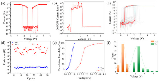 (a) I–V characteristic curve of the Al/starch/Ag/starch/ITO device, (b) switching current ratio, (c) I–V characteristic curve of 50 cycles, (d) device durability, (e) cumulative probability of threshold voltage distribution, and (f) threshold voltage distribution of the device.