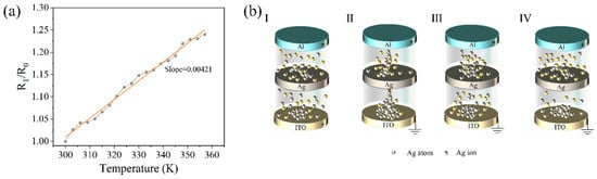 Further tests were conducted to examine the change in the resistance of the device with temperature, as shown in Figure 3a. Here, R0 represents the resistance at a temperature of 300 K, and RT represents the resistance at temperature T. The slope in the graph is approximately 4.21 × 10−3, suggesting that the resistance switching is caused by the formation and rupture of Ag conductive filaments in the dielectric layer. The conductive mechanism model of the device is depicted in Figure 3b. When no bias is applied, the particles in the dielectric layer are randomly distributed, and the device is in a high-resistance state (HRS), as shown in Figure 3b-I. When a positive bias is applied to the top electrode, the Ag atoms in the middle silver layer are oxidized into Ag ions under the influence of the electric field. These ions migrate toward the bottom electrode in the dielectric layer and capture electrons to reduce back to atoms, leading to the accumulation of atoms. As the external voltage increases, the electric field intensifies, and the local Joule heat under high current enhances the migration rate of cations. When enough silver atoms accumulate, they form conductive filaments connecting the top electrode to the bottom electrode in the dielectric layer, significantly increasing the device’s conductivity and shifting it to the low resistance state (LRS), as shown in Figure 3b-II. However, the current passing through these small local conductive filaments generates a large amount of Joule heat, causing a rapid increase in the temperature of the filaments and leading to their rupture. At this point, the resistance between the Ag layer and the ITO electrode increases, as shown in Figure 3b-III. Additionally, as the external bias voltage decreases, due to Coulomb repulsion, Ag ions are pushed back, and the entire device switches back to the HRS, as depicted in Figure 3b-IV.