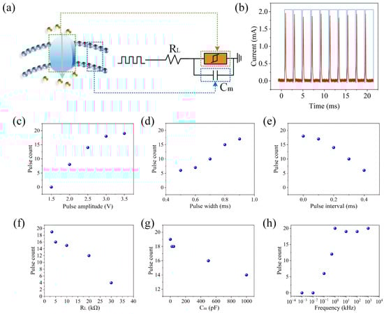 Memristor-based artificial neuron construction. (a) Schematic diagram of artificial neurons. (b) Spike discharge behavior of artificial neurons. The pulse and circuit parameters were adjusted to adjust the characteristics of spiking neurons: (c) change in pulse amplitude, (d) change in pulse width, (e) change in pulse interval, (f) change in resistance, (g) change in capacitance, and (h) change in input frequency.