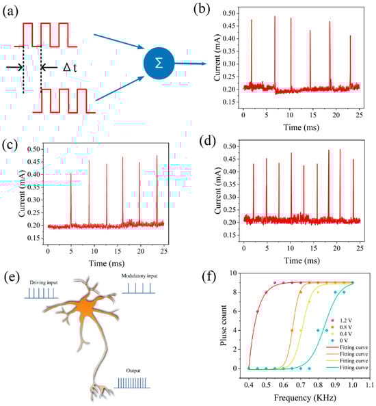 Neurons can also perform spatiotemporal summation of input information, as illustrated in Figure 5a. When two temporally correlated pulse sequences were applied (amplitude 1 V, width 1.9 ms, interval 0.1 ms, repeated 10 cycles), the discharge frequency of the artificial neuron was also a function of the time interval between the two pulse sequences. When the time difference was 2.2 ms (Δt = 2.2 ms), the neuron had six spike discharges within the same time period (25 ms), as shown in Figure 5b. Similarly, when the time difference was −2.2 ms (Δt = −2.2 ms), the neuron also had six spike discharges, as shown in Figure 5c. However, when the pulses were applied simultaneously, the neuron had nine spike discharges, as illustrated in Figure 5d.