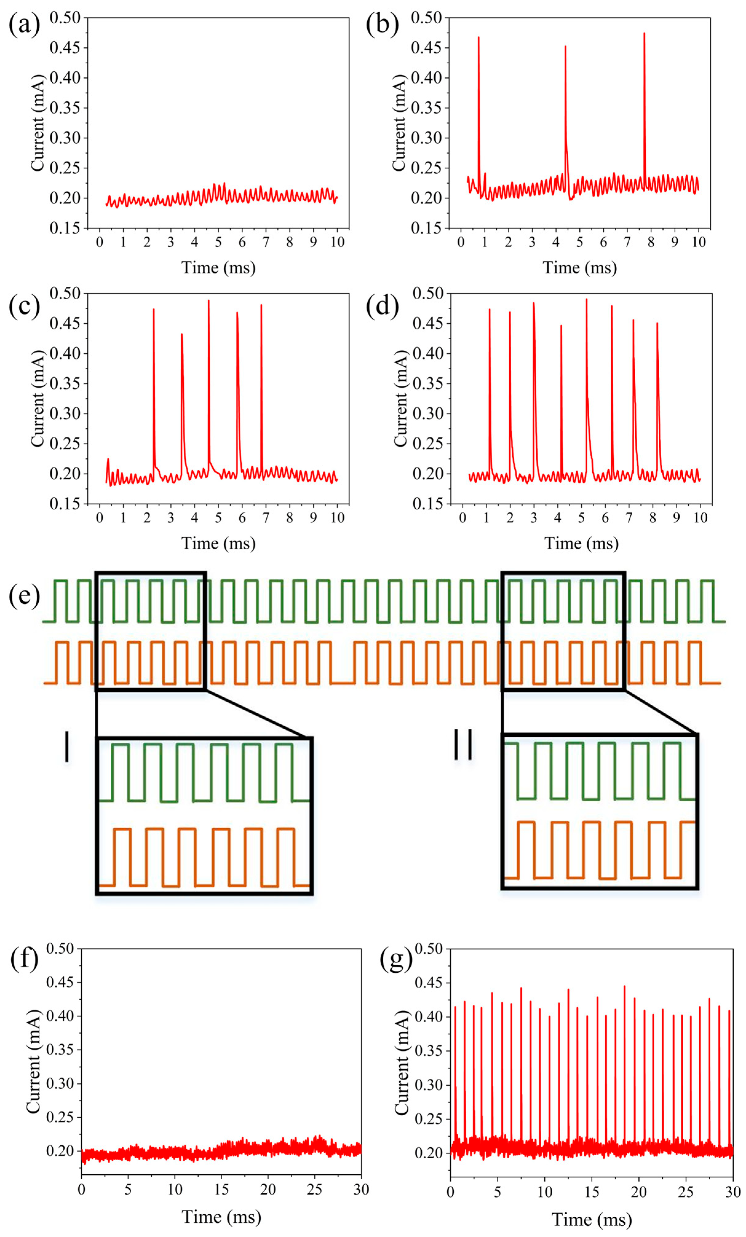 Neuron output with different modulation input amplitudes: (a) amplitude of 0 V, (b) amplitude of 0.4 V, (c) amplitude of 0.8 V, (d) amplitude of 1.2 V. Synchronous detection based on artificial auditory neurons: (e) schematic diagram of the input pulse, (f) neuron output when the input is synchronized, and (g) neuron output when the input is not synchronized.