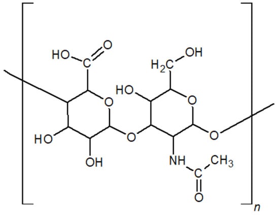 HA is unique among glycosaminoglycans (GAGs) in that it is not sulphated and does not form covalent bonds with the core proteins of proteoglycans. Additionally, unlike other GAGs, it is not synthesised within the Golgi apparatus but at the inner surface of the plasma membrane. HA is also capable of reaching exceptionally high molecular weights—up to 108 Da—whereas other GAGs typically range from 1.5 × 104 to 2 × 104 Da [14,15]. This distinctive structural feature enables HA to retain large amounts of water, which imparts pseudoplastic behaviour and gives rise to its viscoelastic properties: high elasticity under high shear rates and high viscosity at low shear rates [15].