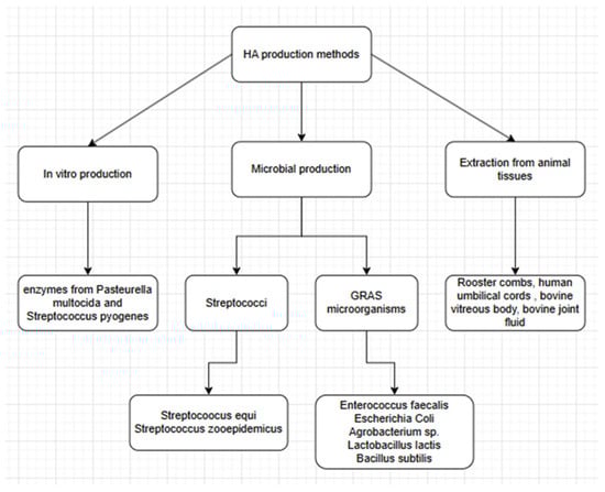 We can distinguish three ways of obtaining HA (Figure 2): extraction from animal tissues, microbial production, and production in vitro. The main differences between these methods are summarized in Table 2.