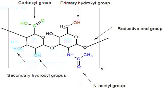 The molecular structure of HA was elucidated in 1970 by T.C. Laurent, and in 1989, Endre Balazs introduced the term “hyaluronan” as a scientifically accurate alternative to “hyaluronic acid” [4,5]. Since then, many studies have been conducted in an effort to gain more insight into HA’s properties. This review compiles the information gathered over the years, both old and new, giving special attention to HA production methods and gel-forming approaches, as those items tend to get less spotlight than HA applications. HA is a linear, high-molecular-weight mucopolysaccharide composed of repeating disaccharide units of D-glucuronic acid and N-acetylglucosamine arranged in an alternating sequence (Figure 1) [6]. These monomers are linked by β(1→3) and β(1→4) glycosidic bonds [7]. When both monosaccharides adopt the β-configuration, the resulting structure is highly energetically stable. This is due to the spatial arrangement in which each major functional group (hydroxyl, carboxyl, acetyl, and anomeric carbon) occupies a sterically favourable equatorial position. At the same time, each hydrogen atom resides in the less favourable axial orientation [8]. Consequently, free rotation around the glycosidic bonds within the HA backbone is restricted, resulting in a relatively rigid molecular conformation. In this conformation, nonpolar CH groups alternate with polar groups, which participate in intra- and intermolecular hydrogen bonding, further stabilising the three-dimensional structure of the polymer [9].
