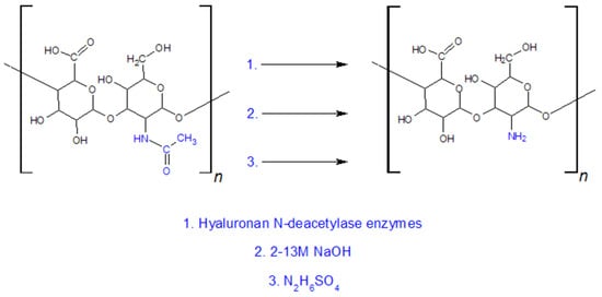 - Sedláček, J.; Hermannová, M.; Šatínský, D.; Velebný, V. Current analytical methods for the characterization of N-deacetylated hyaluronan: A critical review. Carbohydr. Polym. 2020, 249, 116720. [Google Scholar] [CrossRef] [PubMed]