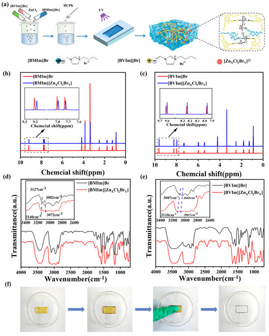 (a) Schematic diagram of the ionogel preparation process; (b) 1H NMR and (d) FT-IR spectra of [BMIm]Br and [Bmim][ZnXCl2BrY]; (c) 1H NMR and (e) FT-IR spectra of [BVIm]Br and [Bmim][ZnXCl2BrY]; (f) durability test of IG-[6].