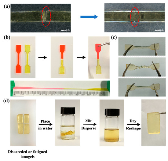 (a,b) Self-healing properties of IG-[6]; (c) photograph of IG-[6] being twisted at ambient temperature; (d) illustration of the recyclability of IG-[6].