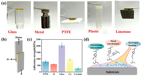 (a) The adhesion performance of IG-[6] on different substrates; (b) corresponding adhesion mechanisms of IG-[6] on PTFE, Al, glass, Cu, and Al. (c) The adhesion strengths and (d) corresponding adhesion mechanisms of IG-[6].