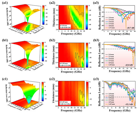 The 3D RL projection plots (1), 2D RL diagrams (2), and RL curves (3) of (a) IG-[6], (b) IG-[8], and (c) IG-[10] in the 2–18 GHz range.