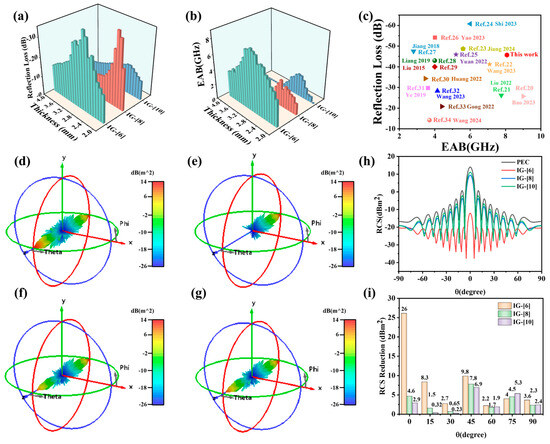 (a) The bar diagrams of the RL values, (b) the bandwidth of ionic gels at the different thicknesses, and (c) the comparison of RLmax and EAB with other EMW absorbers. Three-dimensional simulation model of (d) PEC, (e) IG-[6], (f) IG-[8], and (g) IG-[10]. (h) RCS value of PEC and ionic gels. (i) RCS reduced values of ionic gels at different angles [20,21,22,23,24,25,26,27,28,29,30,31,32,33,34].