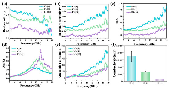 Electromagnetic characteristics of ionic gels: (a) ε′, (b) ε″, (c) . (d) |Zin/Z0|, (e) attenuation constant, and (f) ionic conductivity plots of ionic gels.