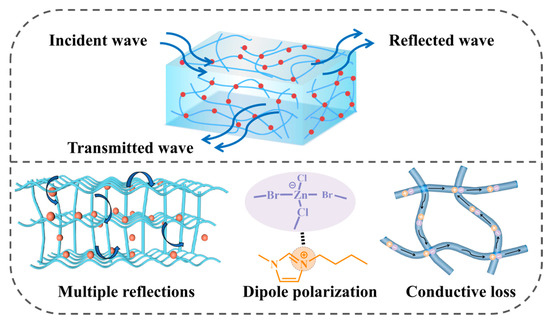 Based on the preceding analysis, an EM wave absorption mechanism for IG-[6] was proposed, as shown in Figure 7. Firstly, proper ionic conductivity endowed IG-[6] with good impedance matching, enabling most of the incident EM wave to penetrate the sample and dissipate without significant reflection. The higher ionic conduction loss derived from the higher dispersion medium content, combined with dipole polarization induced by the N heteroatom in the imidazolium ring and the [ZnxCl2Bry]− anion, quickly dissipated the incident EMW energy. Finally, the unique three-dimensional polymeric architecture within ionic gels promotes multiple scattering events for incoming electromagnetic radiation, thereby increasing the propagation distance and significantly enhancing energy dissipation.