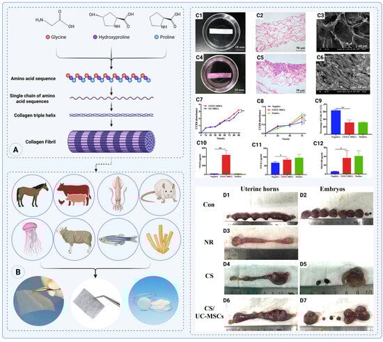 Collagen in anti-adhesion barriers and endometrial regeneration. (A) Structural representation of collagen. (B) Sources of collagen from animal and marine origins and applications of animal- and marine-derived collagens in anti-adhesion barrier system in uterine reconstruction (created with Biorender.com). (C1–C6) Morphological and histological characterization of the collagen scaffold (CS) before and after UC-MSC seeding, showing porous structure, effective cell attachment, and proliferation. (C7–C9) UC-MSCs enhanced HESC proliferation and reduced apoptosis in co-culture. (C10–C12) ELISA confirmed elevated secretion of pro-regenerative factors (VEGF-A, TGF-β1, PDGF-BB). (D1–D7) Gross views of uteri and embryos indicate restored fertility in the CS/UC-MSC group, with higher implantation rates compared to control groups (reproduced with permission, Elsevier). The significance levels are indicated as follows: ** for p < 0.01 and * for p < 0.05.
