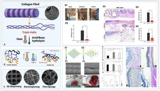 (A) Collagen triple-helix acid and base hydrolysis to break down bonding to form gelatin. (B) Triple helices supported by intermolecular hydrogen bonds cause a gelatin solution to gel when cooled; heating the resultant gelatin gel causes the opposite effect. (C) Application of gelatin as a biomaterial (created with Biorender.com). (D1–D5) Macroscopic and histological assessment of abdominal adhesions 14 days post-surgery. (D1) Representative images of sham, adhesion, and gelatin groups. (D2) Adhesion scores (0–4 scale) show reduced adhesions in the gelatin group. (D3 a-f) Adhesion tissues from the sham, adhesion, and gelatin groups were stained with H&E. Newly formed blood vessels (arrowheads) and multinucleated giant cells (arrows) are visible. Scale bars: (A) a = 500 μm; b, c, e = 100 μm; d, f = 20 μm. (D4) Inflammatory scores (0–3 scale) and (D5) neovessel counts confirm lower inflammation and vascularization in the gelatin group (reproduced with permission, Elsevier) [48]. (E1–E13) Characterization and evaluation of PU GF anti-adhesion film. (E1–E4) Surface topography and structure of PU GF by roughness profiling and SEM imaging. (E5–E6) Rat cecum abrasion model showing injury sites and sutured adhesion setup. (E7–E9) PU GF exhibits superior tensile strength, elasticity, and enhanced fibroblast proliferation over time. (E10–E13) H&E-stained sections reveal reduced inflammation and fibrotic response with Flat GF and PU GF compared to control and conventional films (Copyright: © 2025 Ozamoto et al. (PLoS One), licensed under CC BY 4.0) [49]. The significance levels are indicated as follows: ** for p < 0.01, * for p < 0.05.