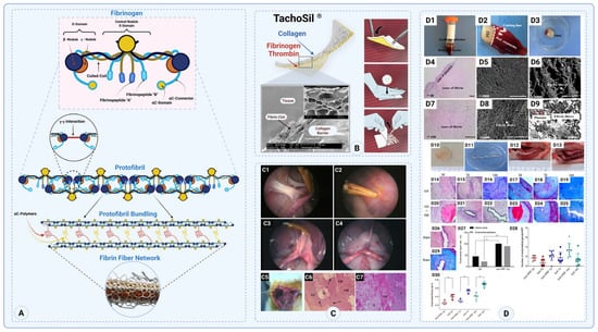 (A) Fibrinogen assembly structure (created with Biorender.com). (B) TachoSil® (Takeda Pharmaceutical Company, Ltd., Osaka, Japan) structure. (C) Postoperative and histological evaluation of intrauterine adhesions. (C1–C4) Laparoscopic views showing varying adhesion severity, from dense uterine adhesions to adhesion-free healing. (C5) Laparotomic view during hysterectomy and peritoneal biopsy in 49 rats/group to assess early effects of TachoSil®. (C6–C7) Histology shows reduced uterine fibrosis and inflammation with TachoSil®, but no peritoneal improvement due to bipolar coagulation injury (UH uterine horn, UC uterine corpus, N necrosis, arrows inflammation) (adapted with permission, Springer) [67]. (D1–D30) Evaluation of PRF structure and its effects on endometrial repair in a rat IUA model. (D1–D9) PRF showed a distinct fibrin network and platelet-rich zones by histology, SEM, and TEM. (D10–D30) PRF transplantation promoted epithelial regeneration, increased gland numbers, and reduced fibrosis compared to the IUA group, with outcomes approaching the sham group by day 14 (Copyright: © 2023 Mao et al. (Frontiers), licensed under CC BY 4.0) [68]. The significance levels are indicated as follows: *** for p < 0.001, ** for p < 0.01 and * for p < 0.05.