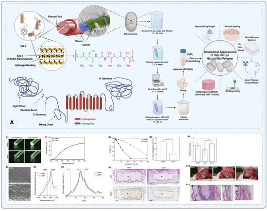 (A) Silk fibroin structure, synthesis, fabrication, and application as a natural biopolymer (created with Biorender.com). (B1–B5) Physical properties of HMW and LMW SF hydrogels, including gelation (B1), light transmittance (B2), SEM (B3), FTIR (B4), and XRD patterns (B5). B6–B8: Biodegradation analysis of SF hydrogels via in vitro (B6, B7) and in vivo (B8) studies, showing faster degradation in LMW SF (* p < 0.05, *** p < 0.0001). (B9–B11) Anti-adhesion effects of SF hydrogels in rats at day 7, with lower adhesion scores in LMW SF (B9), supported by gross (B10) and histological images (B11) (C, A, F, and asterisks indicate cecum, abdominal wall, fibrous tissue, and remaining SF hydrogels, respectively.) (reproduced with permission, ACS) [89].