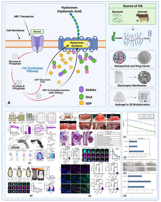 (A) Illustration of the hyaluronan (HA) synthesis pathway. Glucose enters the cell via an ABC transporter and is converted to glucose-6-phosphate (1), followed by fructose-6-phosphate (2). Through a series of enzymatic reactions, these intermediates lead to the formation of UDP-glucuronic acid and UDP-N-acetylglucosamine (UDP-GlcNAc) (3). These two precursors are used by the enzyme hyaluronan synthase (4) to polymerize hyaluronan, which is then transported out of the cell. The figure also depicts different sources of HA (bacterial and animal) and its various biomedical applications, including drug carriers, electrospun membranes, and hydrogels in 3D biofabrication (created with Biorender.com). (B1) sHAChiF hydrogel showed rapid gelation, strong viscoelasticity, and effective sprayability with uniform coverage using a custom dual-spray system. (B2) sHAChiF showed low inflammation (via luminol assay) and sustained in vivo retention of both sHA and chitosan for up to 14 days, confirmed by IVIS imaging and fluorescence quantification. (B3) sHAChiF reduced macrophage aggregation and inflammation at injury sites, with strong localization of sHA and chitosan. Flow cytometry showed preferential sHA uptake by small peritoneal macrophages, supporting targeted anti-inflammatory effects (Copyright: © 2024 Song et al. (Springer Nature), licensed under CC BY-NC-ND 4.0) [120]. (C1) Hyalobarrier® (Gel A) (Anika Therapeutics, Inc., Bedford, MA, USA) showed significantly higher viscosity across shear rates compared to HyaRegen® (BioRegen Biomedical (Changzhou) Co., Ltd., Changzhou, China) and MateRegen® (BioRegen Biomedical (Changzhou) Co., Ltd., Changzhou, China), indicating superior mechanical stability. (C2) Hyalobarrier® exhibited the highest peel strength among the tested HA gels, indicating stronger tissue adhesion than HyaRegen® and MateRegen®. (C3) Peel strip images showed less residue and tearing with Hyalobarrier®, confirming its stronger and more cohesive adhesion compared to HyaRegen® and MateRegen® after repeated tests. (C4) HyaRegen® required the highest average extrusion force, while MetaRegen® required the lowest, indicating easier application for MetaRegen® but greater viscosity for HyaRegen® [121].