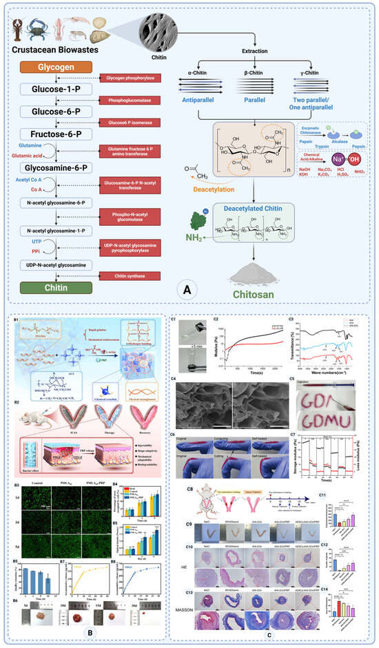 (A) Synthesis of the pathways of chitin in crustacean biowastes and extracted chitosan (created with Biorender.com). (B1,B2) Design of PEGMA/L-serine/PRP hydrogel and its anti-adhesion and PRP-release function. (B3–B5) Cell viability, live/dead staining, and CCK-8 assay confirm good biocompatibility. (B6–B8) Hydrogel shows controlled degradation, sustained VEGF/PDGF release, and in vivo degradation confirmed over 30 days (reproduced with permission, Elsevier) [150]. (C1–C7) tHA-tChi hydrogel shows sol–gel transition, injectability, self-healing, and stable rheology. (C8–C14) In vivo, it improves endometrial thickness, gland number, and reduces fibrosis (reproduced with permission, Elsevier) [151]. The significance levels are indicated as follows: **** p < 0.0001, *** for p < 0.001, ** for p < 0.01, * for p < 0.05, and ns for non-significant differences.