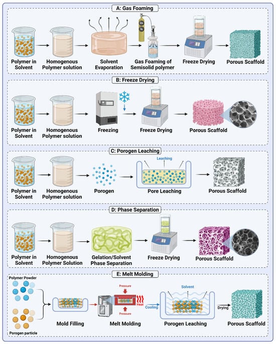 In addition to material composition, fabrication techniques play a pivotal role in determining the performance of biomaterial systems. Conventional methods such as solvent casting, gas foaming, porogen leaching, phase separation, and melt molding are employed to control porosity, mechanical integrity, and degradation behavior. For example, gas foaming and porogen leaching are widely used to create interconnected porous structures essential for tissue scaffolds, while phase separation and melt molding are leveraged for their ability to produce custom-shaped and load-bearing constructs.