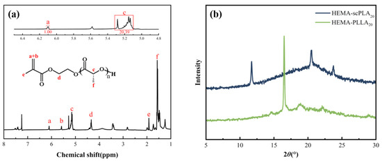 1H NMR diagram of HEMA-PLLA20 (a) and XRD spectrum of HEMA-scPLA20 and HEMA-PLLA20 (b).