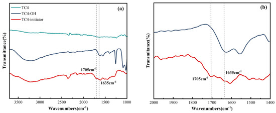 In order to visualize the two weak absorption peaks at 1705 cm−1 and 1635 cm−1 of the TC4-initiator’s spectrum more intuitively, we enlarged the FT-IR spectra in the wavelength range of 1400–2000 cm−1, and Figure 2b shows the locally enlarged FT-IR spectra.